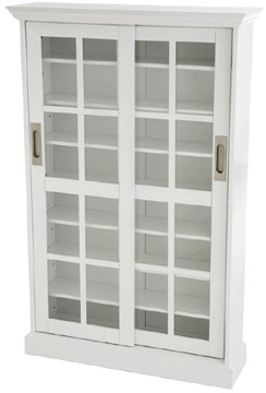 With a classic look of elegance, the beautiful Window Pane Media Storage Cabinet will become a centerpiece for any room. Meticulous detail was taken all aspects and features a plinth base, crown molding and unique, window pane style doors that add that final touch of excellence. Don't forget that this magnificent looking cabinet is also very functional and can easily accommodate a small-to-medium sized music or movie collection. Features: White finish 8 Total shelf spaces 5 Adjustable shelves, 2 fixed (top shelf center shelf) Sliding doors with windowpanes Solid birch doors with medium-density fiberboard and birch veneer Holds up to 536 CDs, 248 DVDs or 136 VHS tapes Or any combination of the above Assembles quickly and easily Specifications: Overall dimensions: 31.75" W x 48.75" H x 9.25" D Shelf (fixed adjustable) dimensions: 28" W x 6" D Door dimensions: 15" W x 44" H.../ Southern Enterprises White Window Pane Media Storage Cabinet / Dvd Shelves